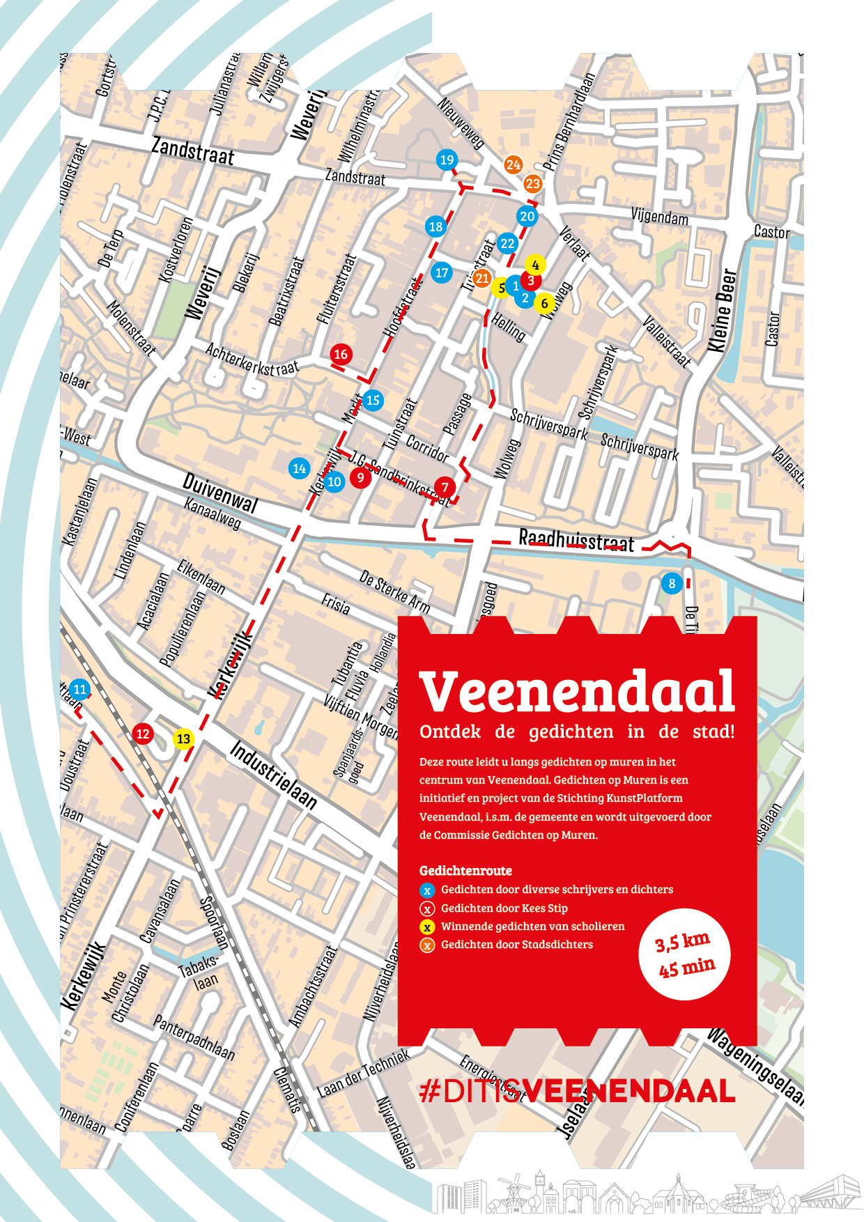 Onderstaande route leidt u langs gedichten op muren in het centrum van Veenendaal. Gedichten op Muren is een initiatief en project van de Stichting KunstPlatform Veenendaal, i.s.m. de gemeente en wordt uitgevoerd door de Commissie Gedichten op Muren. Met dank aan Kunstplatform Veenendaal.