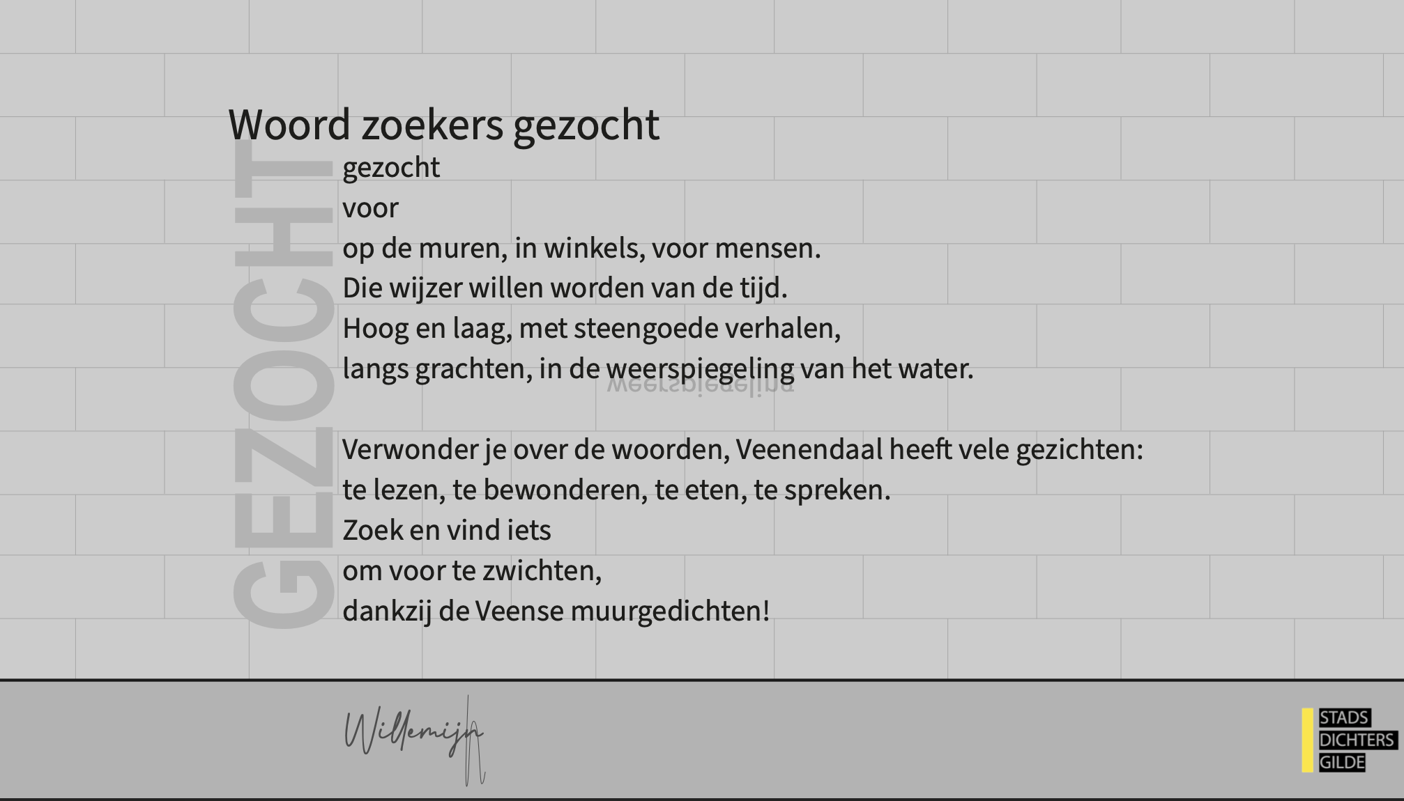 De commissie Gedichten op Muren begon in 2009 met het plaatsen van een aantal gedichten van de in Veenendaal geboren en getogen Kees Stip. Nu treft u op muren van diverse panden in het centrum van Veenendaal en sporadisch ook daar buiten, veel meer gedichten. En niet alleen van Kees Stip, maar ook van andere schrijvers en dichters. Tussen deze gedichten hangen ook de winnende gedichten van scholieren die hebben meegedaan aan de jaarlijkse gedichtenwedstrijd, die de commissie organiseert. Het zal u opvallen dat het vooral luchtige gedichten zijn, al dan niet met een boodschap of knipoog naar de activiteit die in het pand waarop het gedicht is aangebracht, wordt uitgeoefend.