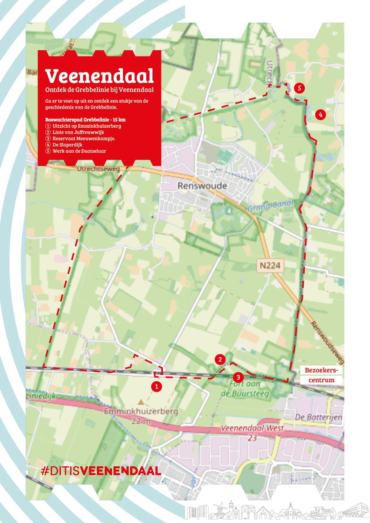 In de Grebbelinie zijn natuur en de sporen van de oorlogsgeschiedenis nauw met In de Grebbelinie zijn natuur en de sporen van de oorlogsgeschiedenis nauw met elkaar verweven. De wandeling over de vroegere verdedigingslinie begint bij elkaar verweven. De wandeling over de vroegere verdedigingslinie begint bij restaurant ‘De Dennen’. Steek de weg over en ga de dijk met bomen op. Je kruist de restaurant ‘De Dennen’. Steek de weg over en ga de dijk met bomen op. Je kruist de Lunterse Beek. Op de kruising van de beek met de dijk is in 1799 het Werk aan den Lunterse Beek. Op de kruising van de beek met de dijk is in 1799 het Werk aan den Engelaar gemaakt, een werk van hoge wallen met grachten. Steek de weg over en ga Engelaar gemaakt, een werk van hoge wallen met grachten. Steek de weg over en ga rechtdoor (geel / rood NS). rechtdoor (geel / rood NS).