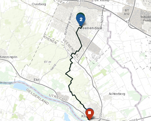 Deze route gaat eerst vanaf de Markt in Veenendaal naar de rand van de Utrechtse Heuvelrug. Je hebt een prachtig uitzicht na het beklimmen van de Heuvelrug. Na de bossen komt Rhenen in zicht en kan je de Cuneratoren bewonderen. Dubbelklik op de kaart hieronder om de route in detail te kunnen zien.