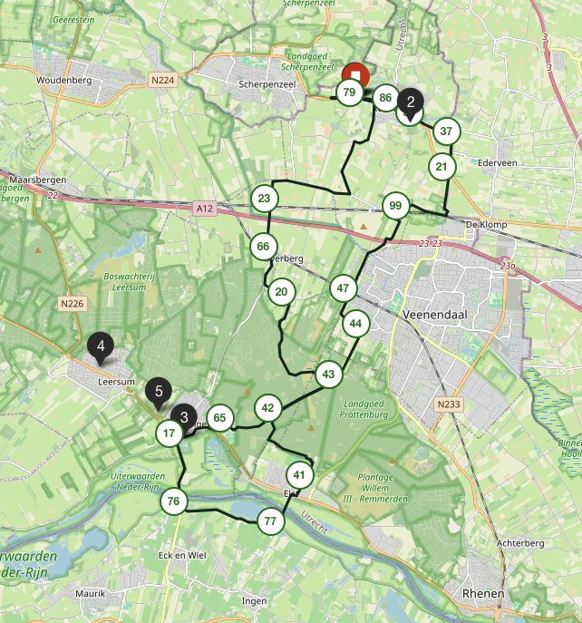 Het beste van twee werelden wordt gecombineerd in deze fietsroute: het bosrijke zuidelijke gebied van de Utrechtse Heuvelrug en het binnenlandse gebied dat tussen de stad Veenendaal en het plaatsje Renswoude in ligt. Twee plaatsen overigens die ook het bezoeken waard zijn. Dus stap op de fiets voor deze gevarieerde route, die ook voor kinderen goed te fietsen is. Dubbelklik op onderstaande foto om de route in detail te bekijken.