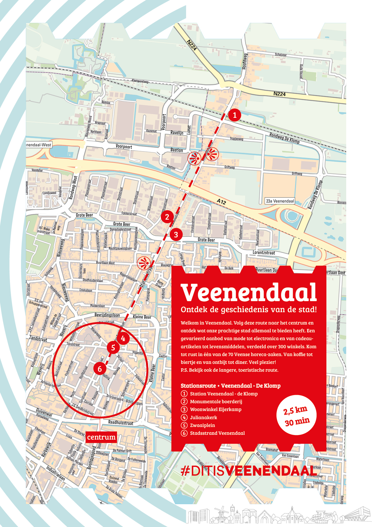 Welkom in Veenendaal! Hopelijk heeft u een goede treinreis gehad naar Veenendaal-de Klomp. Onderweg naar het centrum komt u een aantal bijzondere plekken tegen, zelfs als u de kortste route volgt. Het is bijna één rechte weg naar het centrum, maar deze weg heeft wel drie namen*! Leer ze allemaal onderweg tijdens onderstaande route van ongeveer 2,5 km lang.
